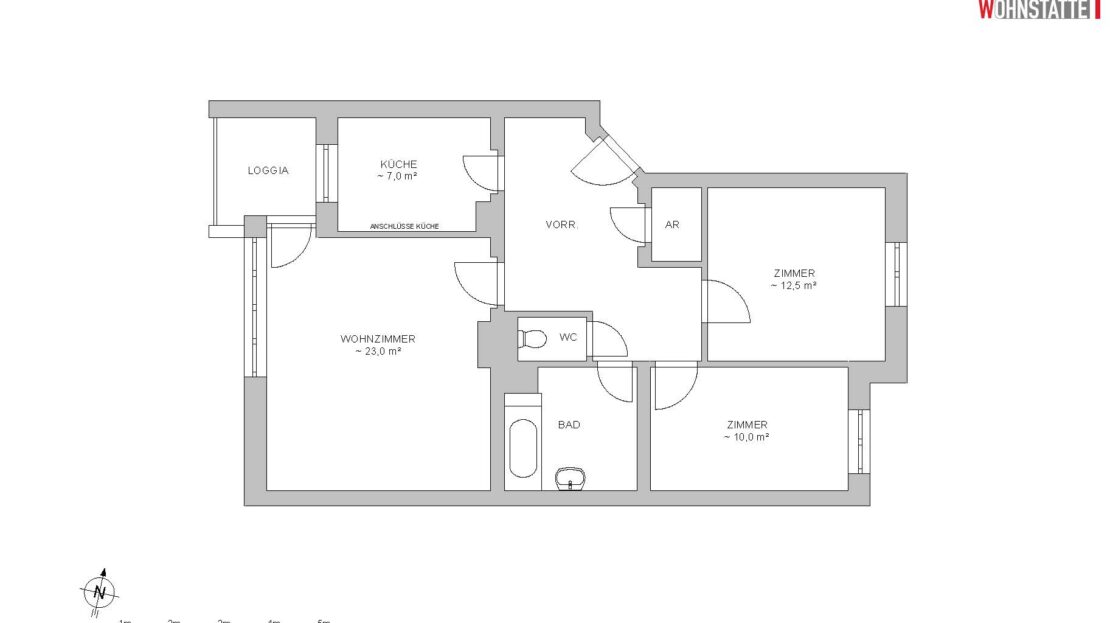 Vorzimmer, Küche, 3 Zimmer, Bad mit Badewanne, WC.