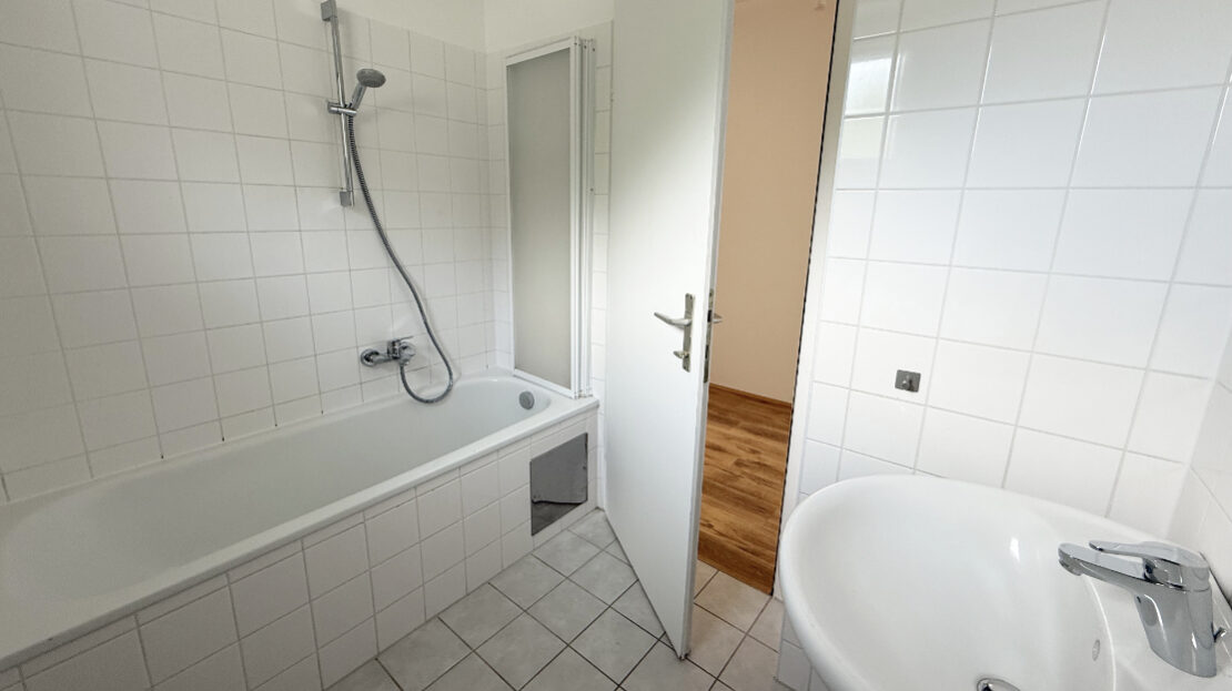 Das Badezimmer ist mit einer Badewanne ausgestattet und sorgt für entspannte Wohlfühlmomente. Das WC ist separat angelegt und bietet zusätzlichen Komfort im Alltag. Ein praktischer Abstellraum schafft wertvollen Stauraum.