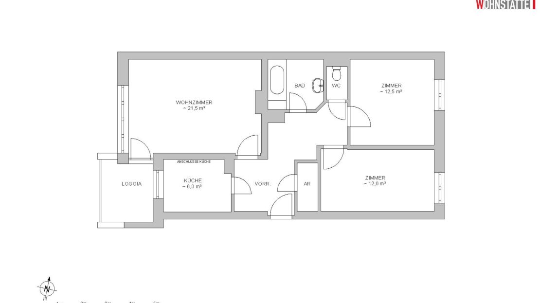 Vorzimmer, Küche, 3 Zimmer, Bad mit Badewanne, WC.